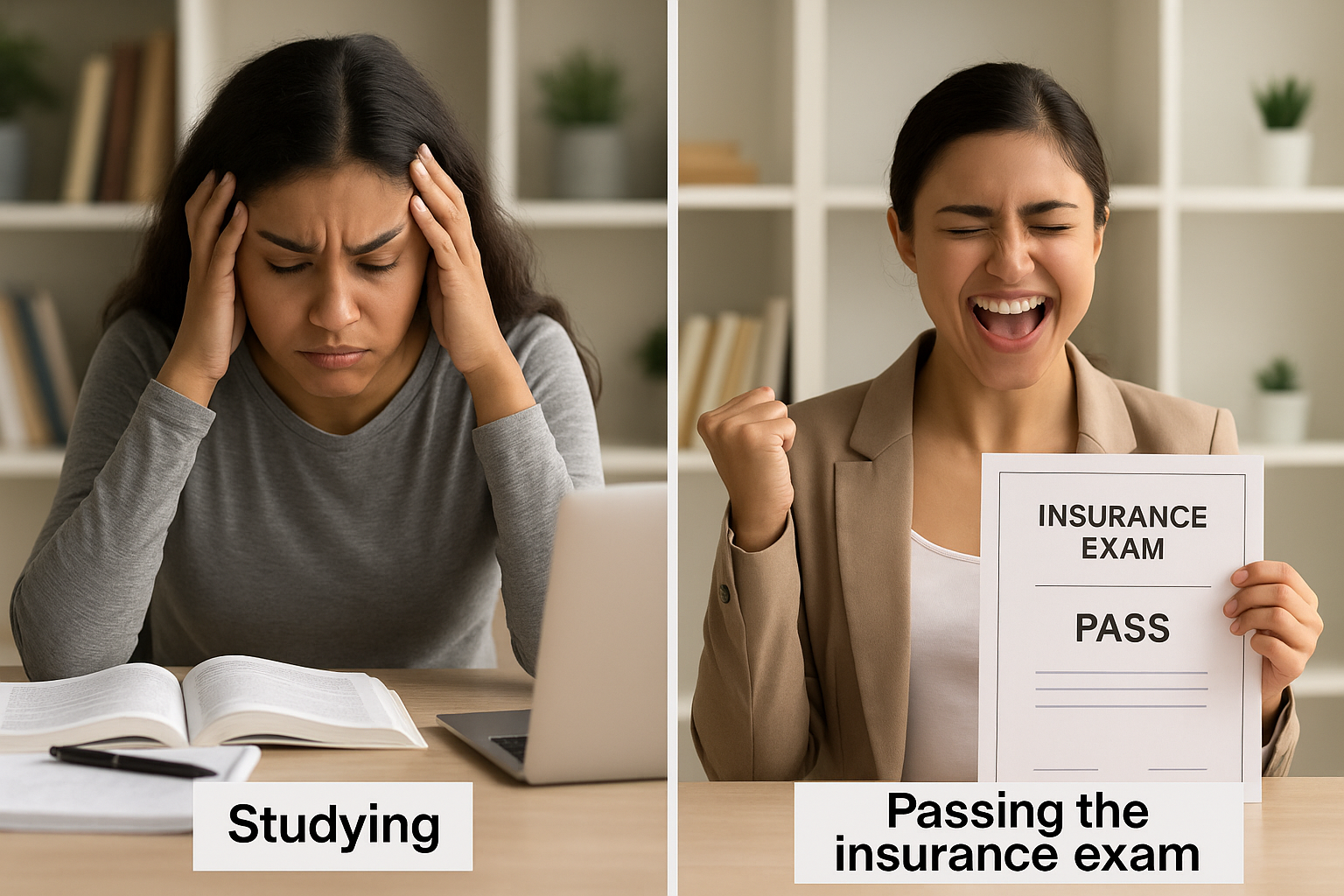 Split image of two women. The woman on the left, with dark hair, is studying with a focused and stressed expression, surrounded by books and a laptop. The woman on the right, with dark hair pulled back, is celebrating triumphantly while holding an insurance exam pass paper in a well-lit room with a bookshelf in the background.